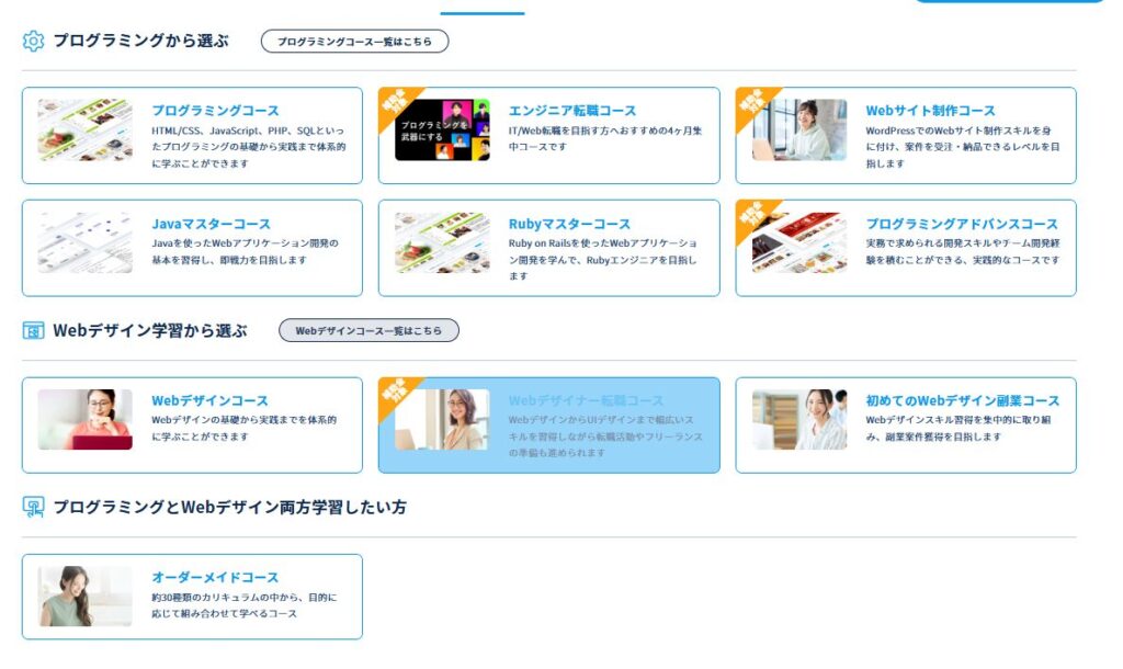 プログラミングとWEBデザインを両方学びたい人や、特定の言語やスキルだけを重点的に学びたい人向けに設計されています。