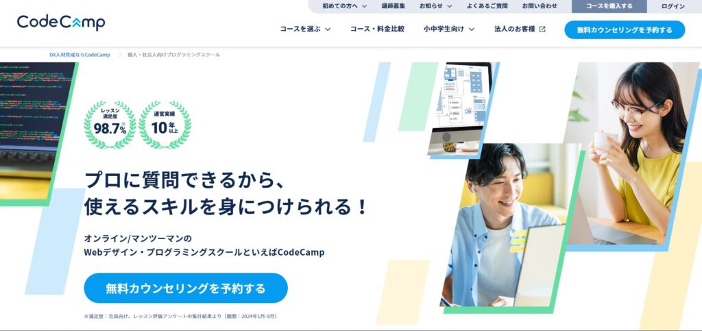 CodeCamp(コードキャンプ)は、オンライン完結型で現役プロからマンツーマン指導を受けられる、未経験者や社会人向けに設計されたプログラミングスクールです。